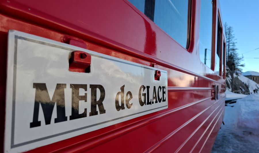 Une excursion à la ½ journée ou à la journée qui débute par la montée au Montenvers à bord de l’iconique train rouge de Chamonix (train à crémaillère inauguré en 1909 de Chamonix (1042m) au Montenvers (1913m).