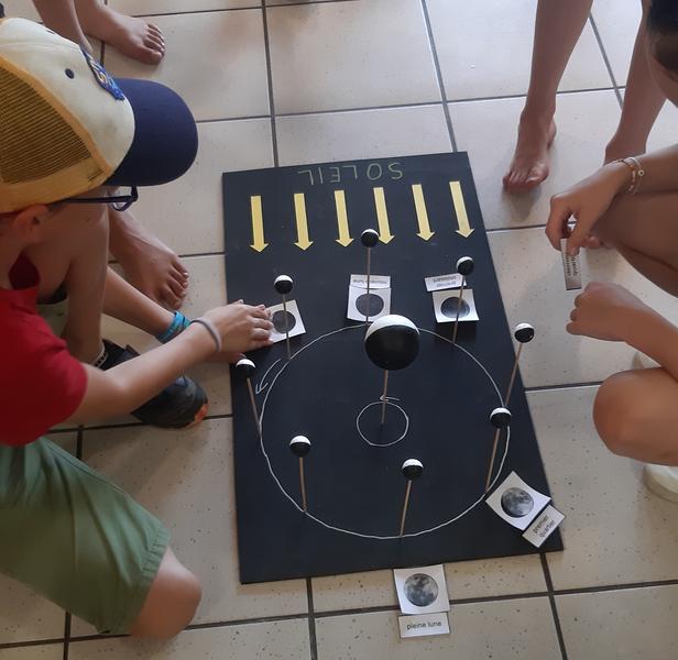 Puis, les enfants manipulent des maquettes qui expliquent le fonctionnement du cycle jour/nuit, des phases de la Lune et du cycle des saisons.